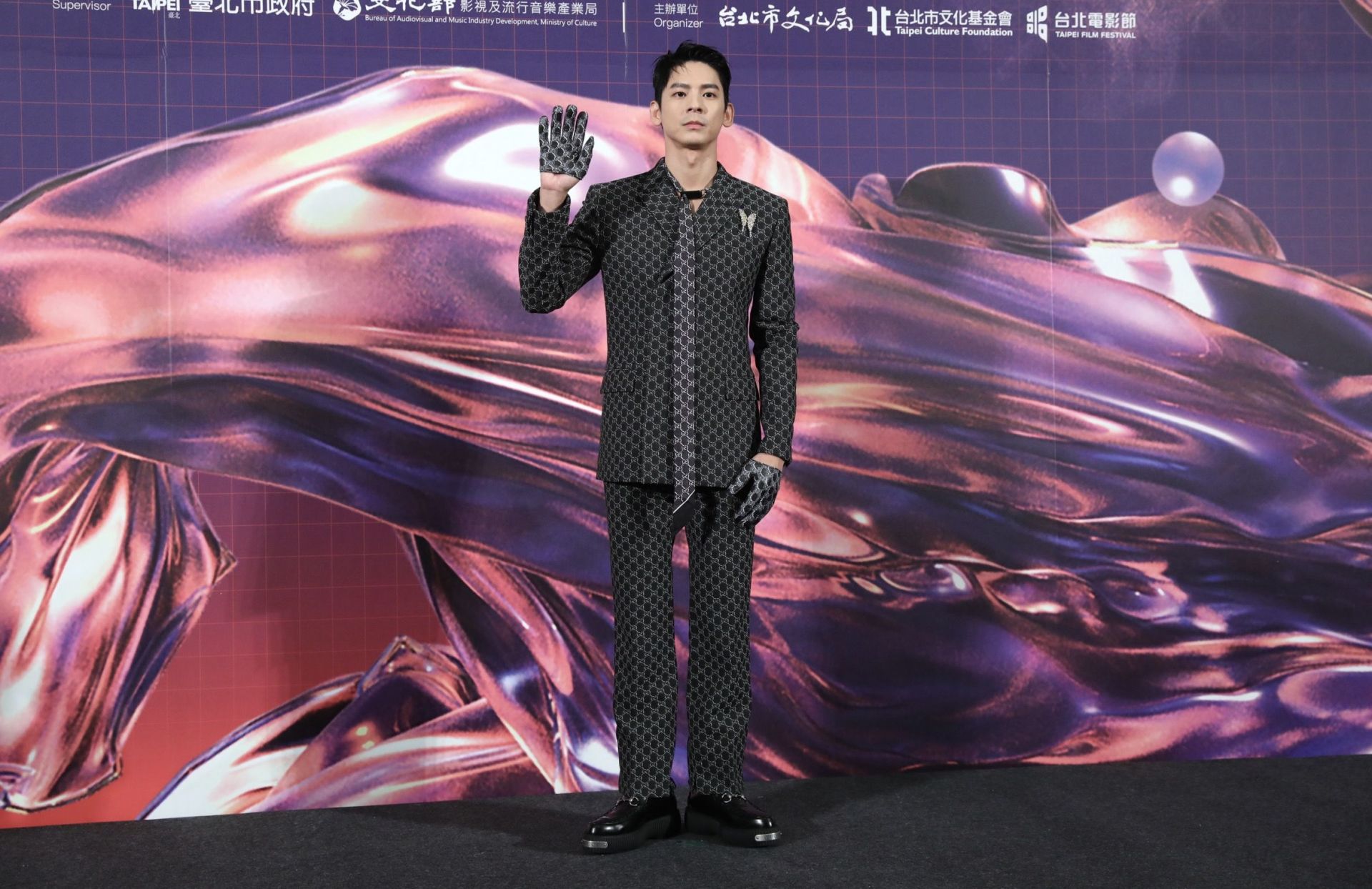男星方面,則以林柏宏最為吸睛。他身穿Gucci滿版GG Logo的灰色套裝,以飄逸長領巾取代一般領帶,並搭配同色系手套,再巧妙將伯爵(PIAGET)約3600萬元的Golden Hour頂級珠寶系列鉑金黃鑽耳環轉換成胸針佩戴,化身為優雅貴公子。