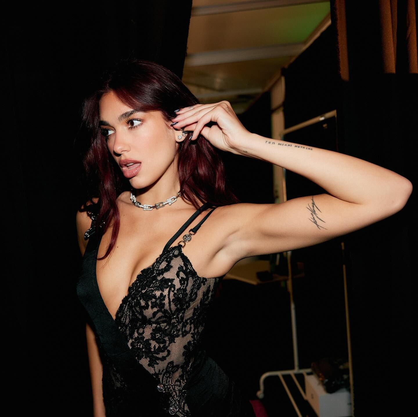 除了性感的服裝之外,杜娃黎波的珠寶搭配也值得注意。她佩戴了Tiffany & Co.的HardWear鑽石項鍊,為整體造型增添奢華感。這條項鍊似乎已成她的幸運首飾,她無論是在演唱會上、出席活動時,都會佩戴。