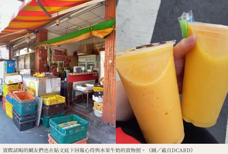 原PO點出這間位在台中大墩路跟大墩十街路口的果汁攤,雖然店面不起眼,不過在老闆的製作過程中能看見「沒有加水加糖,只有水果跟牛奶」,純粹的健康果汁喝起來超香濃又不貴,而且買一杯又送一杯哈密瓜鳳梨汁,讓她忍不住貼出總共1400cc的果汁實物照,發文推薦「超級好喝」。