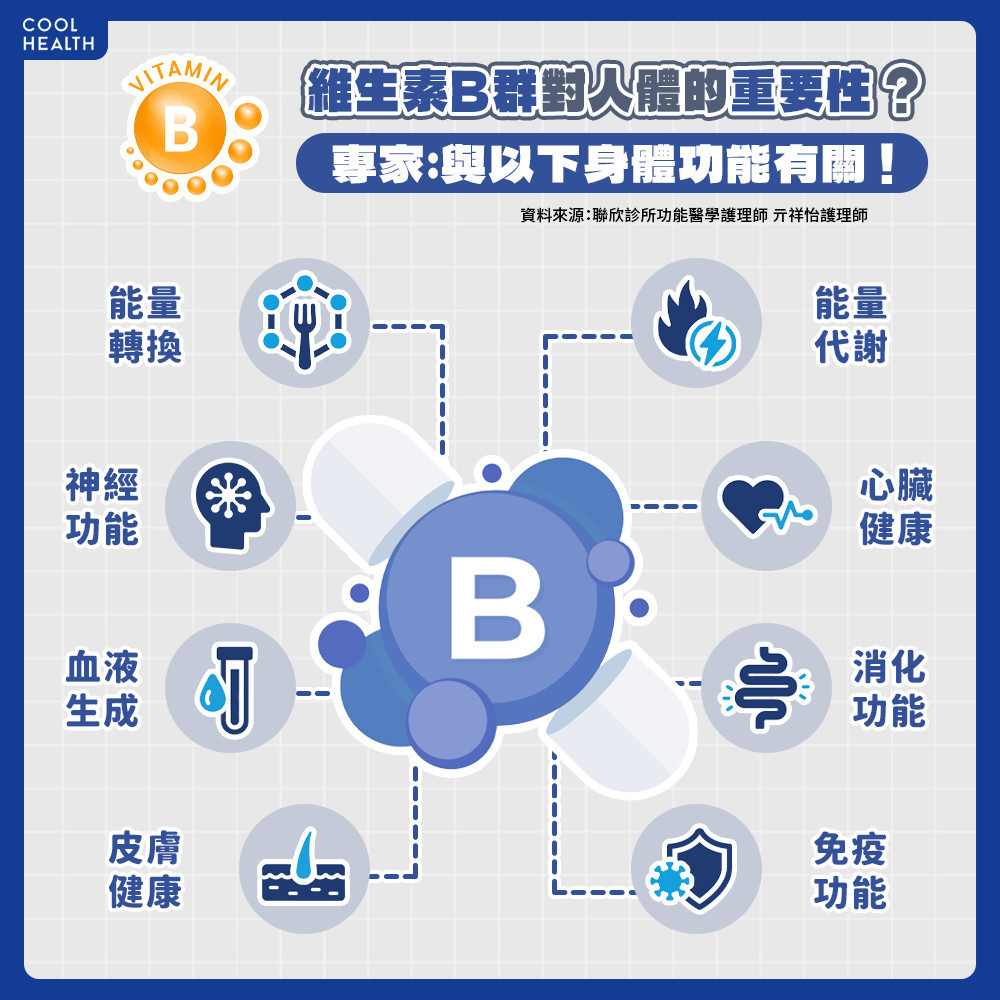根據聯欣診所功能醫學護理師亓祥怡指出,不同類型的B群營養素各有其獨特的功能和作用。例如,B6參與神經傳導物質的合成,有助於情緒調節和壓力管理;而B12則在褪黑激素生成中發揮重要角色,對維持生物時鐘和改善睡眠質量至關重要。