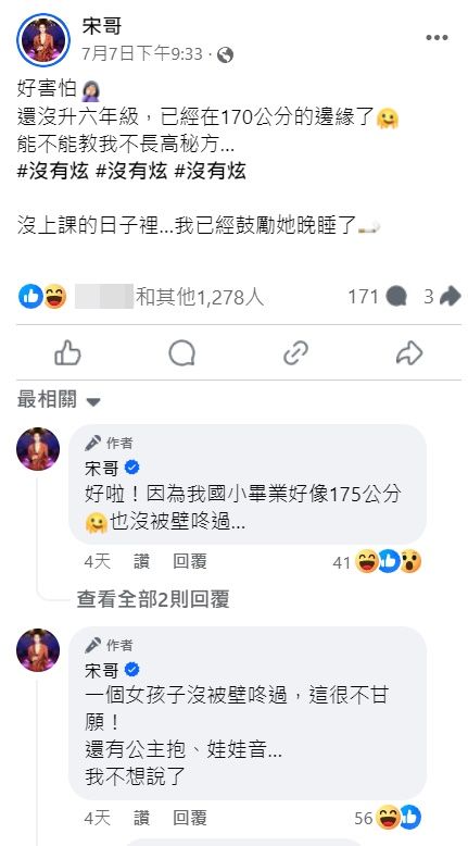 她在帖文中強調不是要炫耀,而是希望網友分享「不長高秘方」,甚至透露在沒有上課的日子裡鼓勵女兒晚睡,以期減緩生長速度。這一言論引來了許多網友的回應和支持,紛紛表示羨慕宋哥家的良好基因和開明的教養方式。
