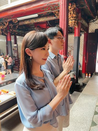 三立新氣象主播陳宥蓉上個月初晉升為人妻,慶祝新婚滿月的星期天,特別和老公安排了一場浪漫的新竹一日遊。這趟旅程不僅是享受二人世界的時光,更是為了一件特別的事情——專程到新竹都城隍廟,帶著喜餅感謝月老的祝福。