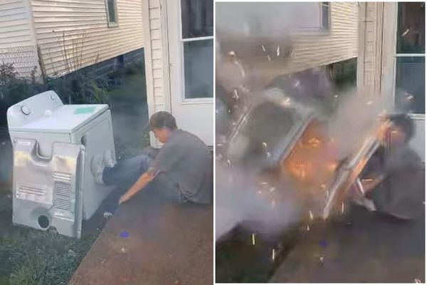 據英國《每日郵報》報導,這位「叔叔」靠近一台裝滿鞭炮的洗衣機,讓雙腳頂住洗衣機。隨著洗衣機開始不對勁,最終直接炸開,叔叔整個人被爆炸威力炸飛,影片清晰拍到這恐怖一幕。