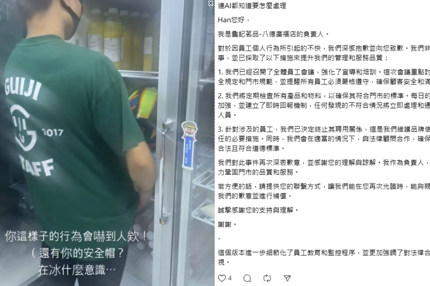 事發後,龜記茗茶八德廣福店的負責人迅速做出回應,表示已對該名員工進行「教育」及「懲處」。店方聲明指出,該員工已被禁止上班時使用手機,並強調若再犯類似事件,將立即開除該名員工。店方也表示,將進一步加強員工的食品安全教育,要求所有門市人員必須遵守食品安全規範,定期檢查門市內所有物品,並即時處理不符合規範的狀況。