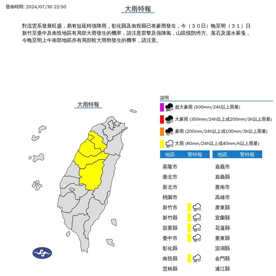 中央氣象署今日針對台灣五個縣市發布大雨特報,警告因對流雲系發展旺盛,可能會出現短時間內強降雨的情況。彰化縣及南投縣已經出現豪雨,氣象專家預測,今(30日)晚至明(31)日,新竹至台中及南投地區將有局部大雨發生的風險,民眾需特別注意雷擊及強陣風的影響。