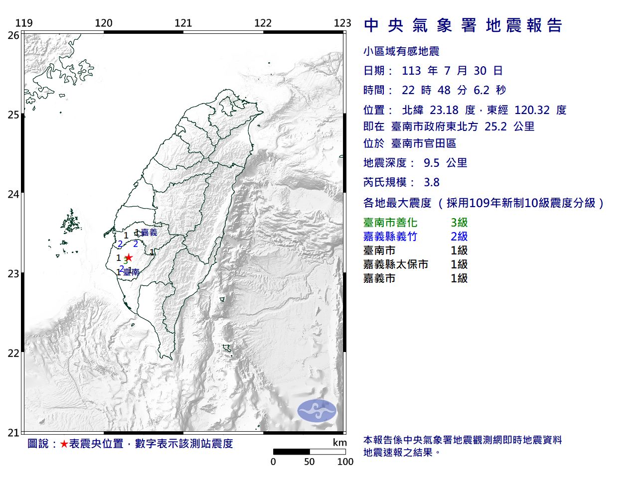 台南市官田區於30日晚間10時48分發生一起芮氏規模3.8的小地震,震央位於台南市政府東北方25.2公里處,深度僅9.5公里,屬於極淺層地震,最大震度達3級。