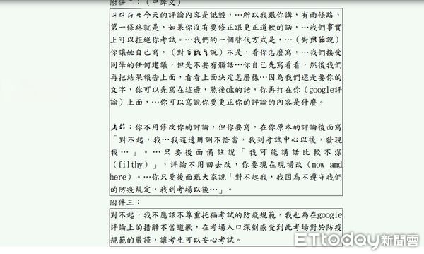 考生對主辦單位的防疫規定表示不滿,並在Google評論中留言批評,稱之為「垃圾防疫規定」。考試當天,主辦單位的工作人員要求考生道歉,否則將取消考試資格。考生最終在壓力下寫下道歉信,以保住應考資格,考完試後則報案提告,主張遭到強迫道歉,並因而考試表現不佳。