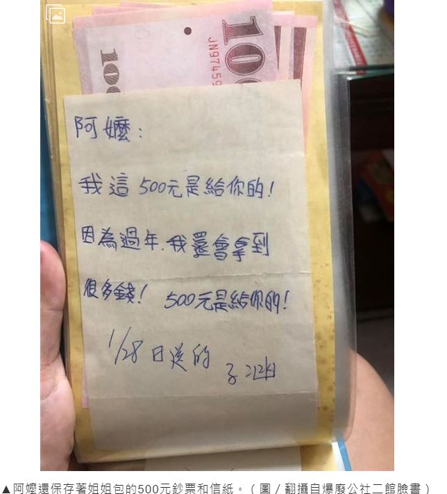 女網友今(28)日在臉書「爆廢公社二館」表示,去阿嬤家的時後,阿嬤給她和姐姐看小時後的影片和照片,突然發現了阿嬤保留了一本蒐集冊,裡面有著幾張百元鈔票,和一個小信紙,用著仍不成熟的字寫著,「阿嬤:我這500元是給你的!因為過年我還會拿到很多錢!子涵」並在最後標註是1月28日送的。