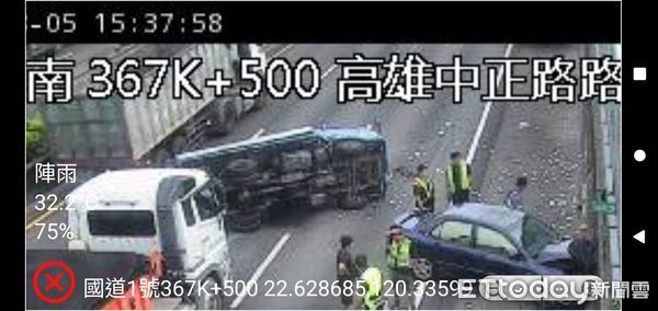 今日15時09分,國道1號南向367.5公里(中正路段)發生一起追撞車禍,造成兩人輕傷並送醫。事故發生在聯結車變換車道時,導致連環撞擊,最終使小貨車側翻。