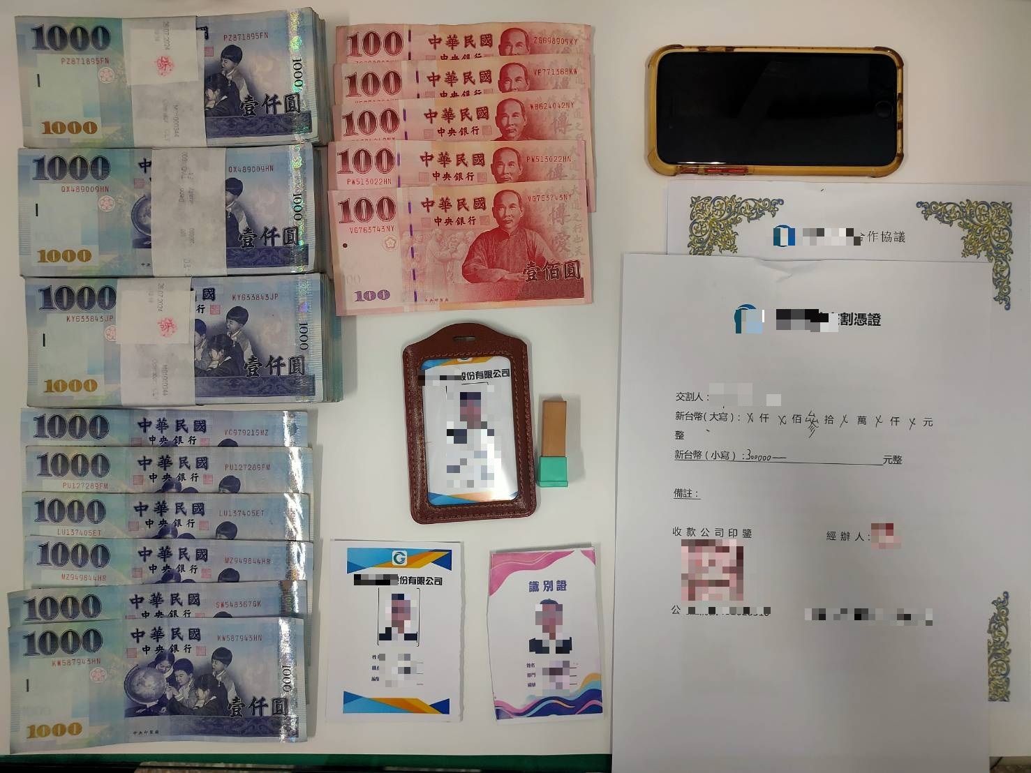 警方跟隨男子到一間超商,發現一名婦人正準備將大筆現金交給他,立即上前盤查。經檢視相關資料,男子坦承從事詐騙車手,警方當場查扣30萬元現金、手機、假合約書及偽造工作證等贓證物。