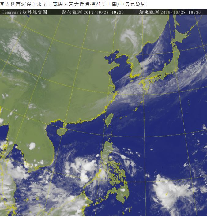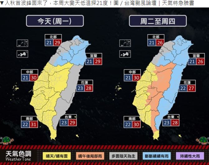 氣象局預報表示,今晚起東北風增強、水氣變多,加上入秋首波鋒面報到,周二、三(29日、30日)越往東北角、宜蘭下雨狀況會越明顯,東北部轉為有短暫雨,雨勢比起白天會更多。溫度部分,北部、東北部、中部約21-22度,花東、南部約22-24度,但周二北部白天高溫會有約3-5度的溫差降幅,從今天的29度降到24-25度,有下雨時,濕涼感受更明顯,中南部則無影響。