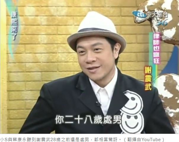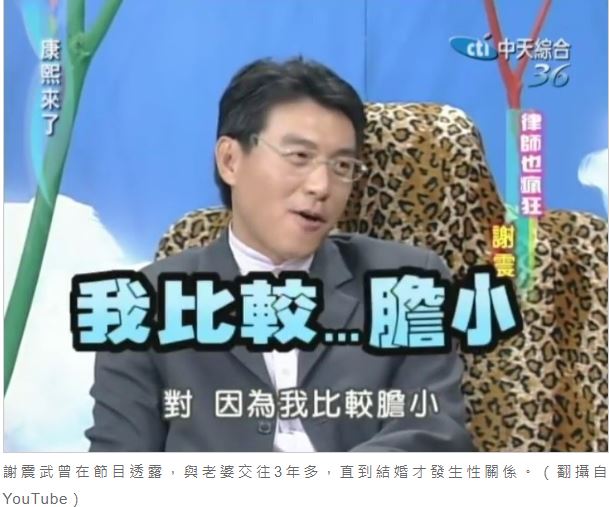 2人才認識2天,謝震武就牽到了老婆的手,半個月後也成功親到嘴,不過後來竟然「卡關」,沒有再更進一步發展,原來因為謝震武是虔誠的天主教徒,他與老婆交往3年多以來,完全沒有性行為,是在他約在28歲左右跟老婆結婚,才終於脫離「處男」之身,此時小S聽到驚呼:「你們3年來就沉迷在舌吻當中嗎?」讓謝震武當場臉紅大叫:「徐熙娣!」一旁蔡康永更是已經笑到不行。