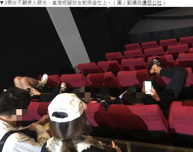 最後,電影散場時,當全場燈光一打開,卻看到令人直搖頭的一幕。從原PO貼出的2張照片,可以見到有3名年輕男女,居然大喇喇地把腳翹在前方座椅上,而其中一名男子更將右腳直接穿越前排座位、懸在半空中,三人正在專心地滑手機,讓原PO當場傻眼,不以為然地說道,「喔…台灣最美的風景是人…」痛批此舉簡直是零素質。