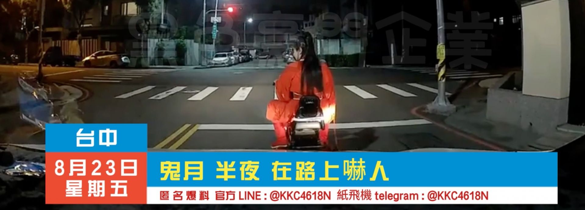 台中市軍福十八路附近,一名穿紅衣、披頭散髮的女子於午夜時分出現在街頭,令經過的市民驚恐不已。此次事件發生在鬼月期間的22:30,街頭目擊者紛紛用手機記錄下這一駭人場景。