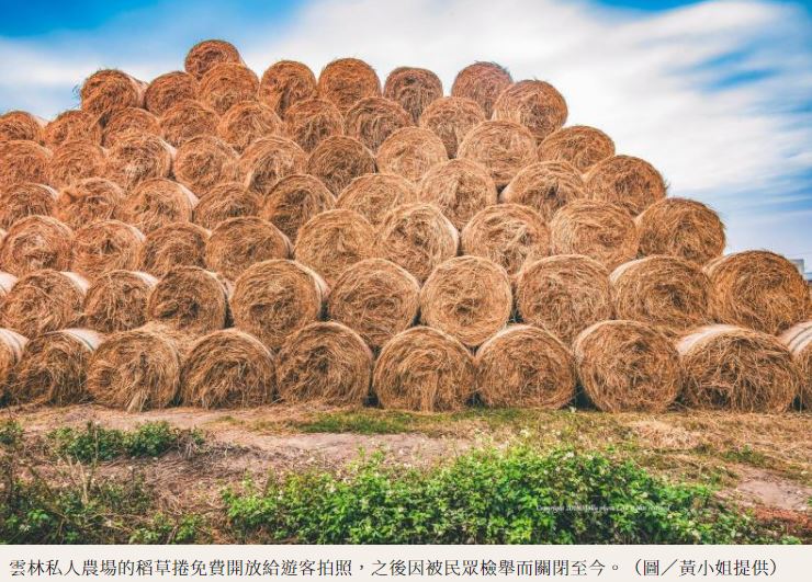 而今年初變身火紅IG地標的「雲林稻草捲」,由農民在稻田收耕後捲成一滾滾的巨輪暫置田野,宛如巨型「捲心酥」的田園場景曾免費讓遊客入內打卡拍美照,造成一股洗版潮,但該農場在開放後,卻被民眾檢舉不當飼養寵物而受到動保處關切,為避免太多不必要的麻煩,地主也在粉專公布只開放至清明連假,至今仍是封閉狀態。