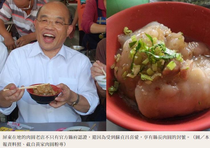 屏東縣政府 傳播暨國際事務處粉專分享,白白胖胖的「屏東肉圓」特色以蒸肉圓為主,不同於中北部的炸肉圓,肉圓外皮沒有油炸過,因此有Q滑的口感,外皮吸附著滿滿的醬汁,口感清爽而不膩,肉圓撒上香菜、芹菜、蒜泥,美味指數無人能敵,還在文末強調是蘇貞昌的愛店。實際上,目前擔任行政院長的蘇貞昌曾在年初PO影片向網友們推薦自己擔任屏東縣長期間,最愛光顧的肉圓店,大推「這家最讚」、「不服來戰」。