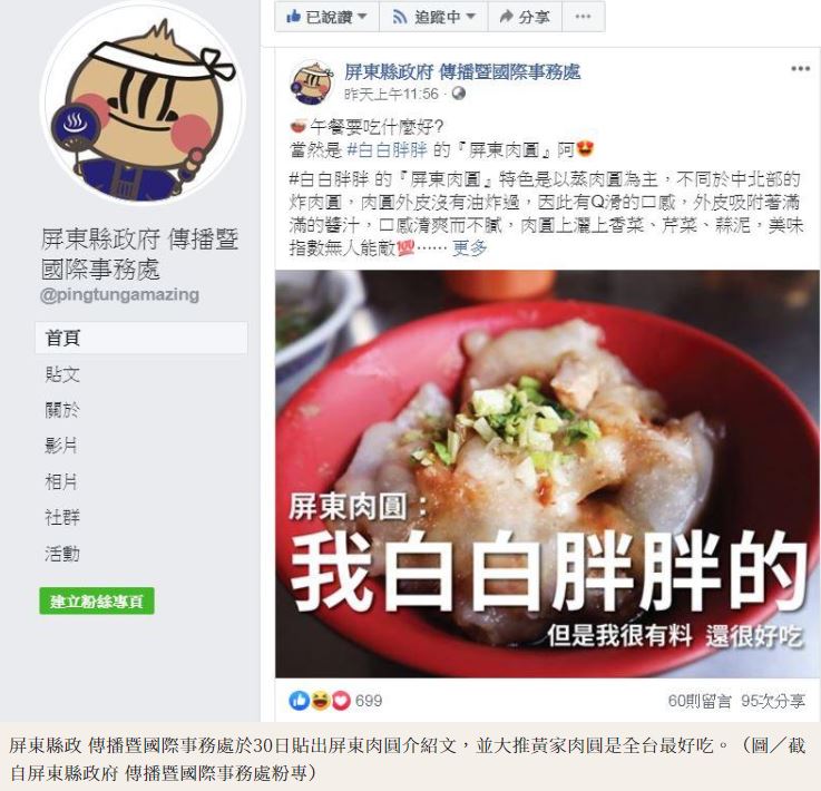 除了彰化大本營之外,屏東也被封為肉圓美食聚集地,昨(30日)屏東縣政府傳播暨國際事務處官方粉專,PO出一張「白白胖胖很有料」的屏東肉圓照片,還在貼文標註#蘇貞昌院長推薦、#全台最好吃的肉圓,讓獲得官方認證的在地小吃,再度引起熱烈討論!
