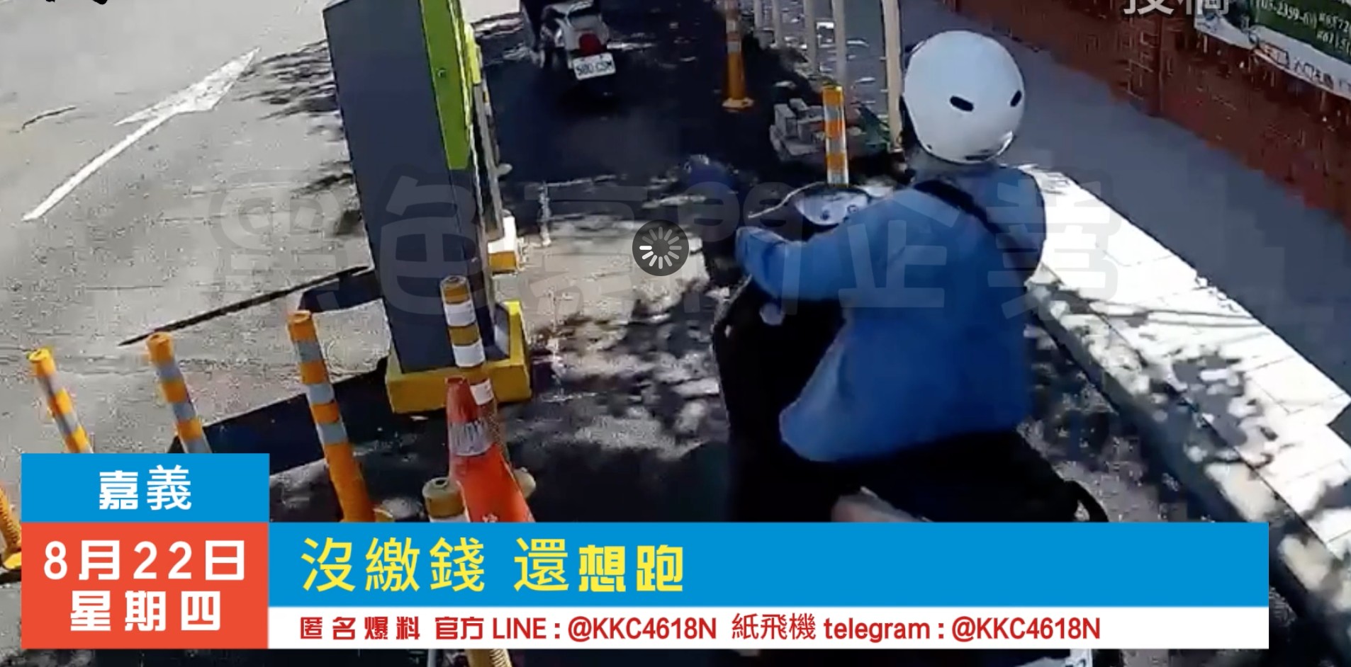 嘉義市西區世賢路二段發生一起機車騎士試圖逃避停車費的事件。該騎士於早上9:44進入停車場時,未支付應有的停車費,並試圖跟隨前車迅速離開。