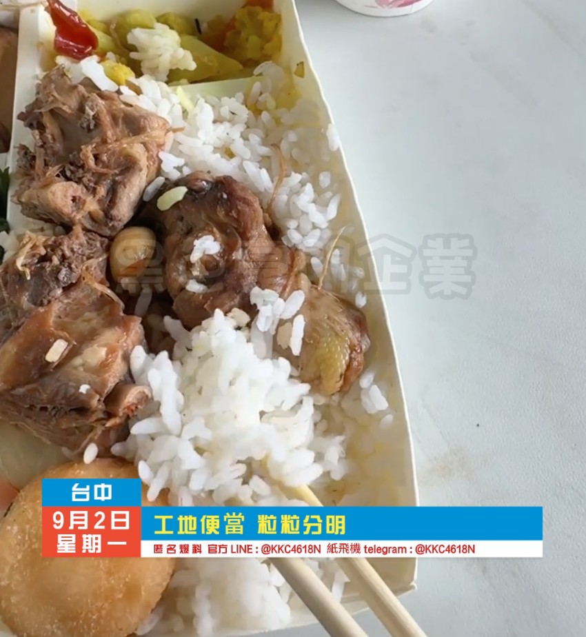2024年9月2日中午12點30分,台中市某工地的便當引發工人不滿。多名工人反映,他們在工地上收到的便當質量極差,米飯粒粒分明,口感乾硬,難以咀嚼,造成吃飯困難。