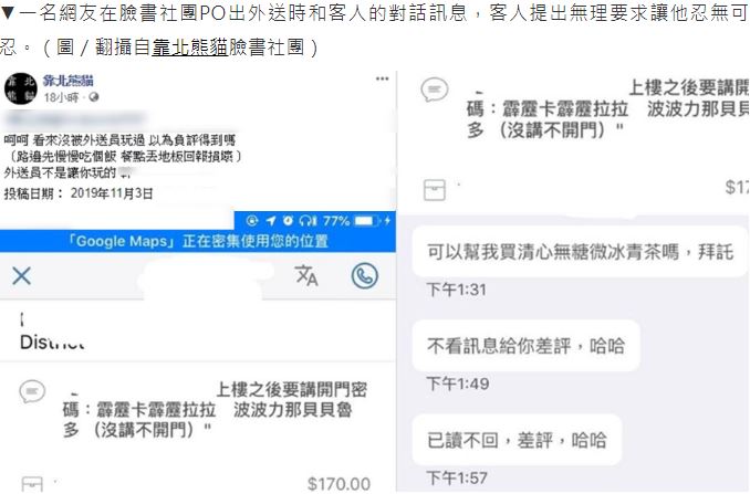 「外送員不是讓你玩的,X!」一名外送員在臉書「靠北熊貓」上貼出一張照片,一名客人要求他要把餐點送上樓,不過要開門卻是有條件,因為這位客人在備註欄上寫著,「上樓之後要講開門密碼:霹靂卡霹靂拉拉,波波力那貝貝魯多(沒講不開門)。」