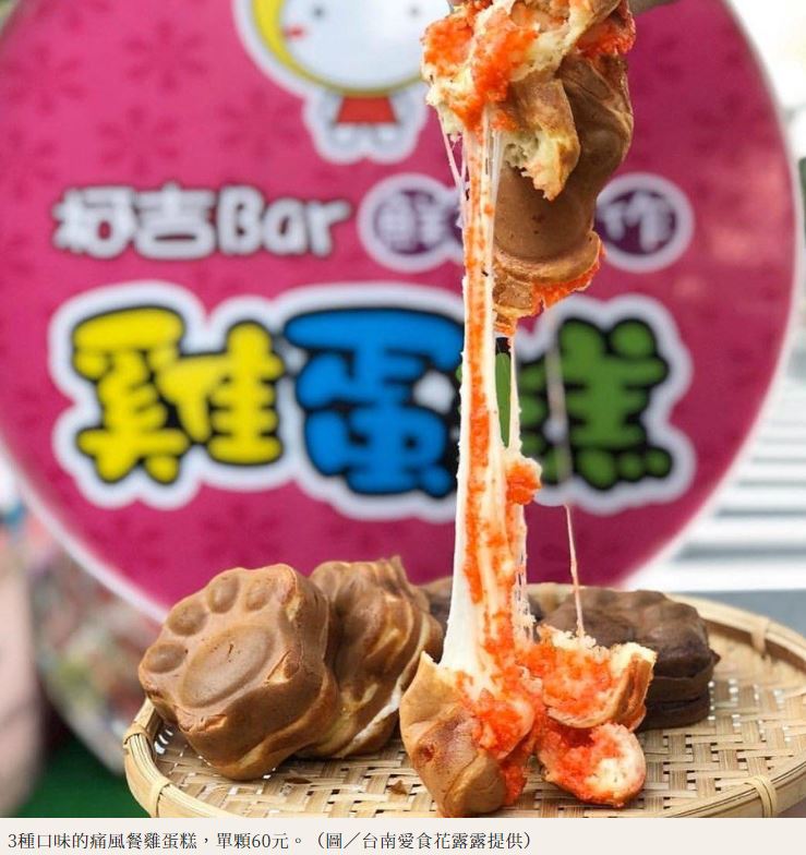 另外想要挑戰升級版口味的吃貨,可以嚐鮮混搭明太子、焗烤蝦扯蛋、我的老天蚵的「痛風餐」,除了視覺感浮誇之外,還能一次嚐到蚵仔、蝦子與明太子,雞蛋糕香氣和海鮮的鮮甜滋味,也迸出意想不到的奇妙口感,成為台南最新爆紅的打卡美食!