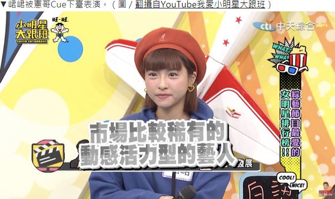 峮峮回過神後立馬被Cue下場跳啦啦隊舞蹈,而峮峮只是簡單的舞動了一下就收尾結束表演,並換張文綺上場跳舞。峮峮表演完後憲哥立馬說,「妳說妳會舞蹈,人家(張文綺)該跳的也能跳,怎麼辦?一定要找到自己更多的特色才可以,峮峮加油!」而憲哥接著透露,先前錄《綜藝玩很大》峮峮一起出外景4天,不料到了最後一天聚餐時仍記不起峮峮的名字,「她是人在但是存在感不高…不誇張。」