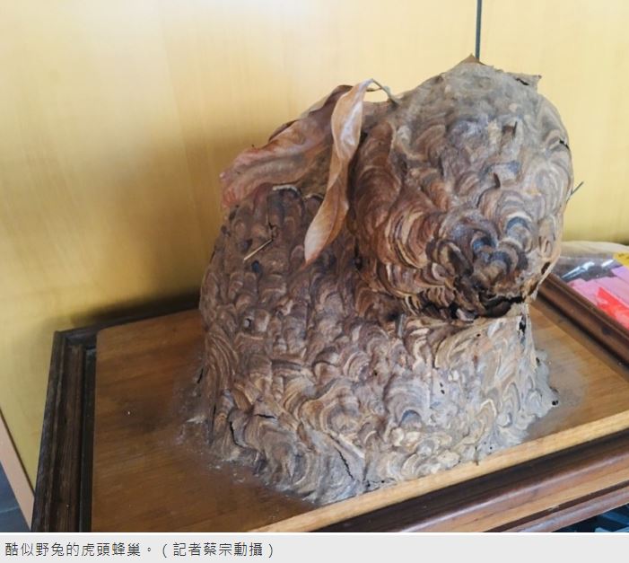 為了讓虎頭蜂窩的材質更棒,蔡明勳還購買檜木廢木料,放在虎頭蜂覓食途徑,虎頭蜂聞到檜木香,會找適合「下口」的地方,用其發達的口器「大顎」如同啄木鳥般啄木頭纖維,咀嚼成小圓球後回去築巢,就這樣一點一點堆砌成工藝大師級的漂亮虎頭蜂窩。