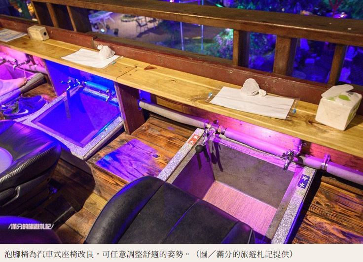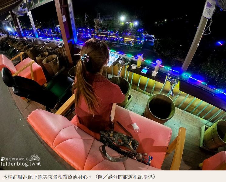 「天空之夜養生泡腳咖啡」設有半露天平台、咖啡廳,結合個人獨立與雙人泡腳池,讓旅人們在寒冬裡能溫暖的眺望夜景,以及欣賞園內的紫色浪漫燈景。景觀咖啡廳分為1樓泡腳用餐區與2樓觀景泡腳區,部落客滿分的旅遊礼記推薦樓上的視角更廣闊,且店家還貼心推出200元的泡腳方案,享受泡腳1小時還免費贈送1杯飲料,一個人也可以舒適體驗,另外座位也特別採用可調整的汽車式座椅,腳底泡得暖呼呼的,還能躺平休息片刻。