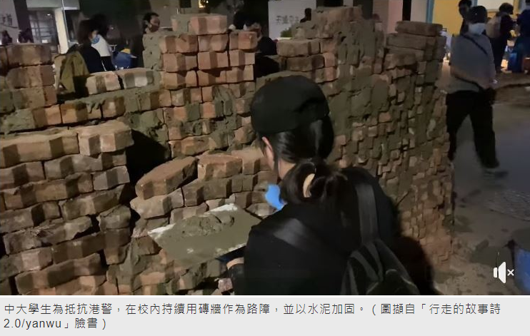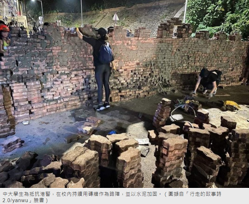 臉書粉專「行走的故事詩2.0/yanwu」也分享,中大學生為抵抗港警,在校內持續用磚牆作為路障,並以水泥加固的畫面。「行走的故事詩2.0/yanwu」稱,中大升級城牆、投石機,「真的好心疼他們在玩真人版的世紀帝國⋯而且對方兵力已經升到頂級⋯⋯」。