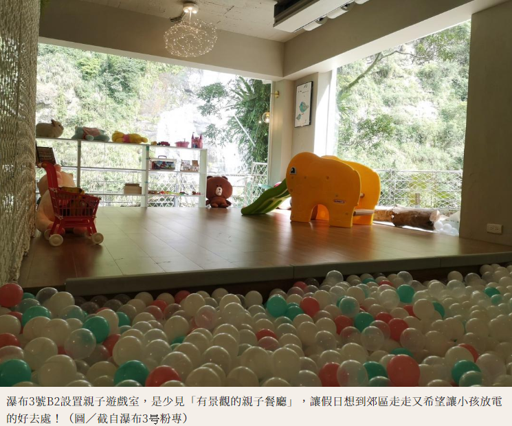 烏來瀑布高達80公尺、寬約10公尺,在日據時期就享有「雲來之瀧」的美名,這座懸谷式瀑布是烏來區的經典地標,以往遊客觀瀑的地點都會選在情人步道或烏來林業生活館的露台上,而最新爆紅的「瀑布3号」共設有3個樓面,包含1樓露天座位、B1靠窗的絕佳視野座位/包廂區,以及B2附有小朋友球池的親子遊樂區,針對不同族群設計能舒適賞景的區域,一次滿足飽覽瀑布、愜意用餐喝咖啡以及遛小孩的需求。