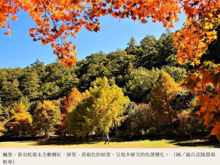 武陵農場粉專表示,青楓、台灣紅榨槭,隨著節令、氣溫下降,由黃、紅、橙多種色彩,在林葉間跳動渲染奇峰幽谷,而國民賓館後方落羽松、楓香正豔麗,當陽光照射著花樹海景致,整座山頭顯得更加閃亮繽紛,同時預告11月底將迎來最佳賞楓期。