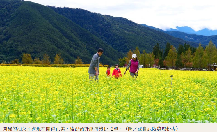 黃橙色的油菜花海是春天最亮眼的美景之一,而中台灣最夯的高山賞楓景點「武陵農場」,目前竟有廣達1公頃的「油菜花田」搶先全台盛開,吸引花迷們上山追景!此外,11月農場也正上演精彩的植物變裝秀,楓葉、落羽松、銀杏樹等逐漸轉色,將山頭染成一片璀璨金黃。