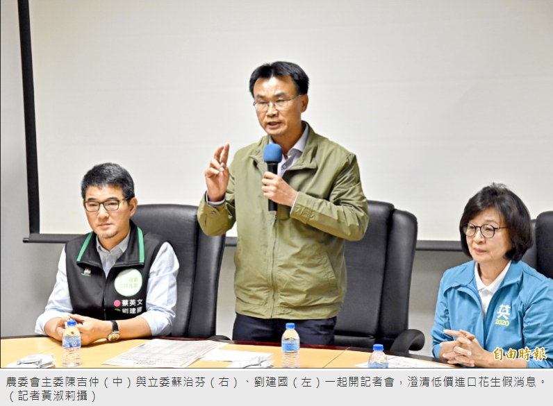 蘇治芬、劉建國表示,「有心人士」拿著一張關稅配額權利金決標紀錄表傳播政府要低價進口花生的假消息,已嚴重影響花生價格,損害農民權益,要求農委會對散播假消息的人開罰。