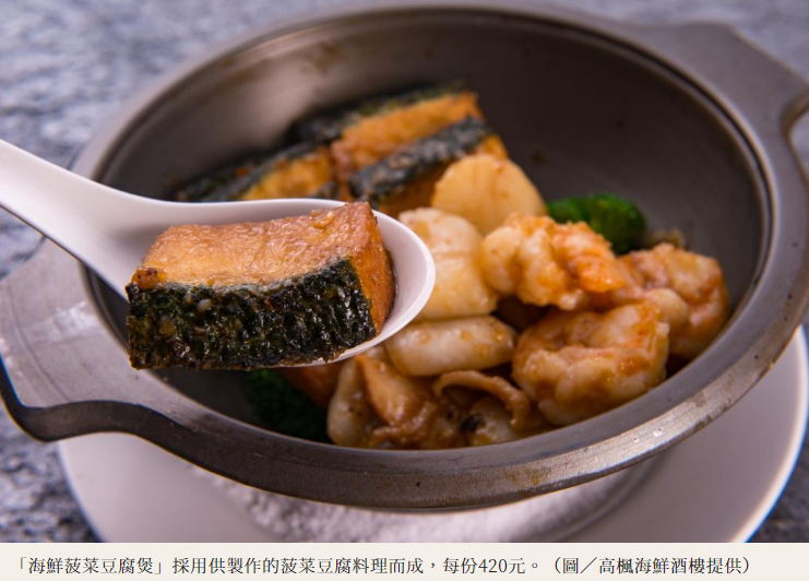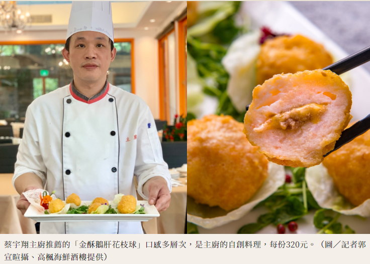蔡主廚最推薦饕客嚐鮮的菜色為「金酥鵝肝花枝球」與「海鮮菠菜豆腐煲」,首先手工製作的炸花枝球與金沙鹹蛋黃進行翻炒,內餡還包著鵝肝與起司等配料,一咬開濃郁驚喜滋味充斥嘴中,層次十分豐富;而另一道手路菜,主廚談到豆腐是以豆漿、雞蛋和菠菜自製而成,製作過程非常繁複,為讓豆腐表層呈現菠菜的綠色與嫩口,得先取嫩葉手工剁碎,只留細緻的纖維鋪於豆腐蛋液上,清蒸後再切小塊輕煎定型,最後與象拔蚌、加拿大鮮干貝以自製柱侯醬、蠔油煨煮,更添鮮味與香濃豆味。