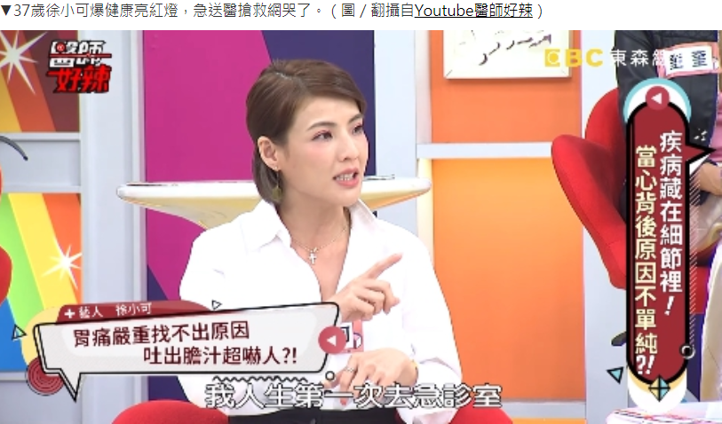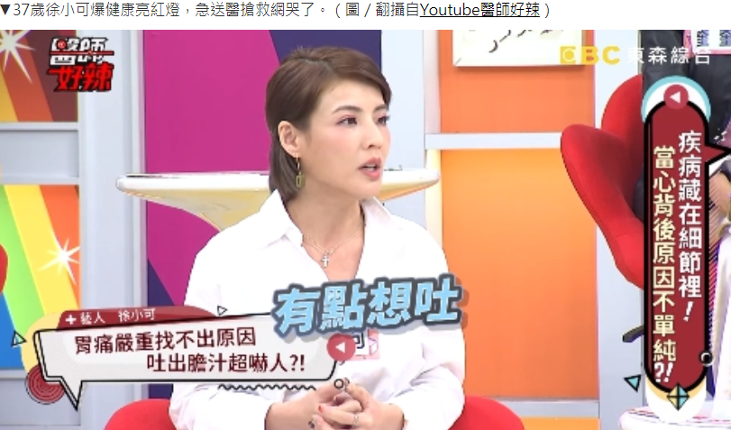 醫生詢問徐小可狀況後,發現她連膽汁都已經吐出來,「難怪妳痛成這樣」,沒想到,如此嚴重的症狀,醫生卻找不出嘔吐原因,抽血、驗尿都正常,幸虧打了點滴一覺醒來,痛感就減緩了很多,外科醫師江坤俊猜測,此情形可能是「腸胃道痙攣」,因為東西無法往下,才會一直從上面擠出來。