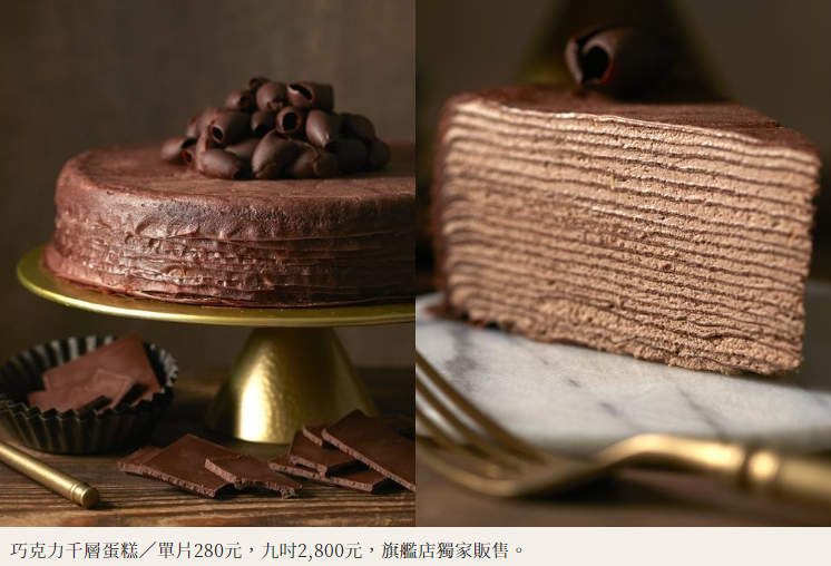 此外,喜愛苦甜濃郁滋味的人一定也不能錯過在旗艦店獨家販售的「巧克力千層蛋糕」,頂端以口感溫和的牛奶巧克力做最終點綴,濃郁香氣的可可盛宴帶來撫慰人心的甜美,細細勾勒出如同絲絨般高貴典雅的巧克力鮮奶油。