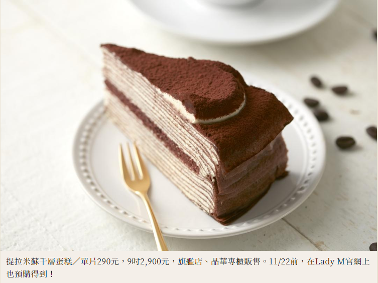 Lady M全新口味「提拉米蘇千層蛋糕」每層薄透蛋皮皆以法國頂級法芙娜巧克力製成,如慕斯般的滑順口感讓人無法抗拒。而中間的海綿蛋糕,巧妙加入令人難以抗拒的椹果甜酒,與Espresso厚實的香氣結合,細膩抹上義大利Mascarpone cheese(馬斯卡彭起司)於千層間,苦韻提升了蛋糕的深度,吃起來更有層次!提拉米蘇你吃過,就更應該要吃過千層蛋糕的版本!