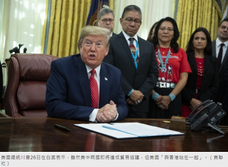 川普說,美國和中國的貿易談判已進入「最後陣痛」,「我和習近平主席的關係很不錯,我們即將談妥一項非常重要的協議,甚至可以說是迄今在貿易方面最重要的協議之一。」川普是在白宮簽署一項打擊原住民女性暴力問題的行政命令,被記者問到他是否有話要和港人說時,發表上述評論。但在此同時,「我們也希望看到香港一切順利」。