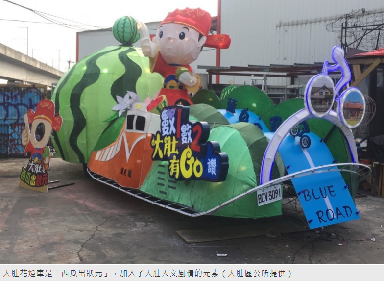 大肚區的農特產是西瓜,佔了台中市產量30%,大肚西瓜相當知名,此外,大肚還有磺溪書院,每年都會為考生舉辦祈福,另有藍色公路、追分車站等景點,大肚區公所便把大肚的農特產及景點都元素都納入花燈車內,設計出「西瓜出狀元」的花燈車。