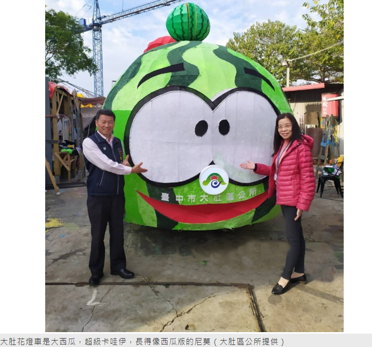 大肚區公所設計的「西瓜出狀元」花燈車,以大西瓜為花燈車的主題,長得非常可愛,有點像西瓜版的尼莫,大西瓜上還有小西瓜,在一定時間會有文昌君跳出來。