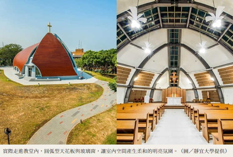 這座新建的教堂由4片咖啡色木製弧形牆版,覆蓋在純白色的建築上,屋頂上方有巨大的玻璃十字架,當陽光透過十字玻璃進入教堂,呈現不同角度光影的變化,充滿設計感又唯美,從靜宜校門走到主顧聖母堂是一條筆直的路徑,更有象徵通往幸福之路的涵義,一開放就有新人預約拍攝婚紗。