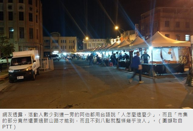 網友透露,活動人數少到連一旁的阿伯都用台語說,「人怎麼這麼少」,而且「市集的部分竟然還要過鼓山路才能到,而且不到八點就整條幾乎沒人」,他也提到,其實市集攤位還不錯,大多都是年輕人在擺攤,賣的東西也有別於一般夜市小吃,直言「選舉前硬要倉促地弄一個免費的音樂祭,整個規劃感覺都不太行」。