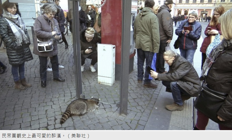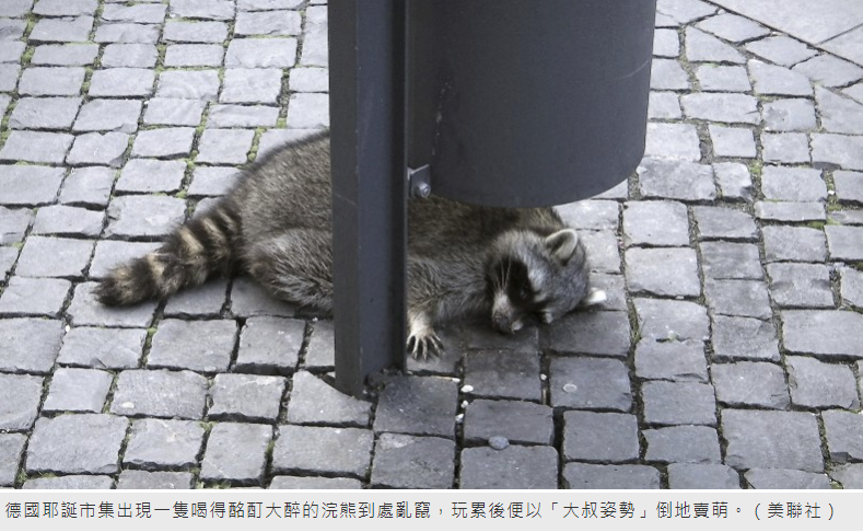 德國艾爾福特(Erfurt)耶誕市集,日前出現一隻喝得酩酊大醉的浣熊到處亂竄,隨後體力不支以「大叔姿勢」倒地賣萌,警方百般無奈地說,他們實在無法對這位「醉漢」做呼氣酒測。 據《德國之聲》報導,浣熊喝醉後先是四處遊蕩,然後到處摸著女性的鞋子玩耍,接著便倒地休息,此時許多民眾都上前圍觀,因為這可能是史上最可愛的「醉漢」了。 然而,這段童話般的故事卻迎來殘酷結局,當地消防單位將其帶到動物收容所後,又移交給獵人處理,獵人則依照歐盟法規將浣熊射殺。