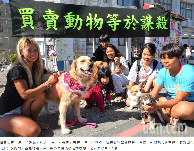 吳姓市集發起人笑說,只是巧合而己,然而,在商業性動物買賣的背後,長期關在窄小狗籠內的種狗被施打荷爾蒙、老了失用利用價值被棄置的問題,買賣動物是否等於謀殺,值得大家深思,沒有買買,就不會有傷害。義賣市集會場的對街,就是恆春鎮一家新開張兼做寵物買賣的大型寵物用品店,加上懸掛醒目的「買賣動物等於謀殺」布條,形成強烈對比,也給人隔街向寵物店無言抗議的聯想。