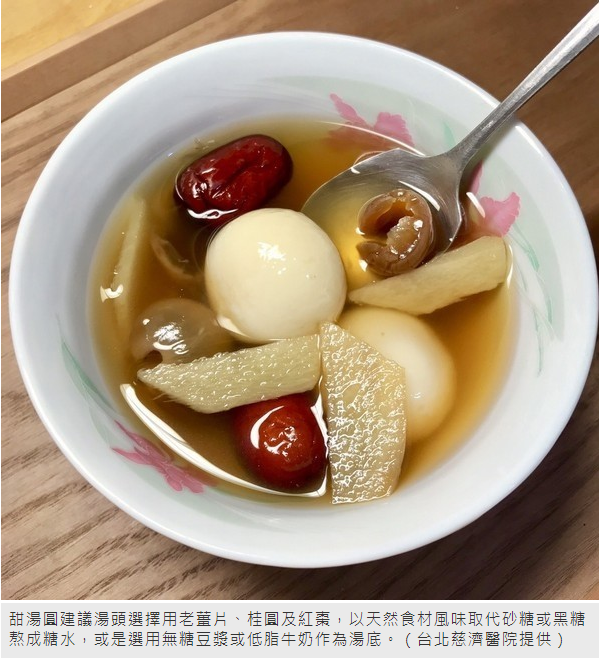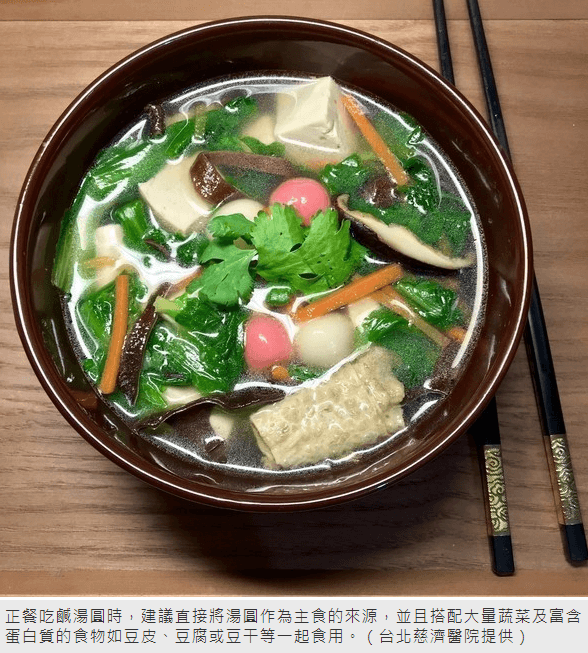 而甜湯圓則建議在湯頭的選擇可以用老薑片、桂圓及紅棗,以天然食材的風味取代砂糖或黑糖等所熬成的糖水,或是選用無糖豆漿或低脂牛奶作為湯底,避免精緻糖類攝取過量。趙馨儀叮嚀,不管是甜或鹹內餡的湯圓建議一餐食用兩顆為宜,而無餡料的紅白小湯圓建議不超過16至20顆,當正餐吃鹹湯圓時,建議直接將湯圓作為主食的來源,並且搭配大量蔬菜及富含蛋白質的食物如豆皮、豆腐或豆干等一起食用,較有飽足感且能吃得均衡營養。