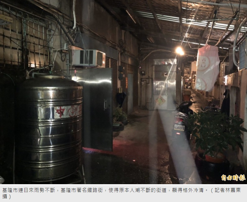 基隆市連日來雨勢不斷,加上已近關門時間,原本人潮不斷的街道,顯得格外冷清。