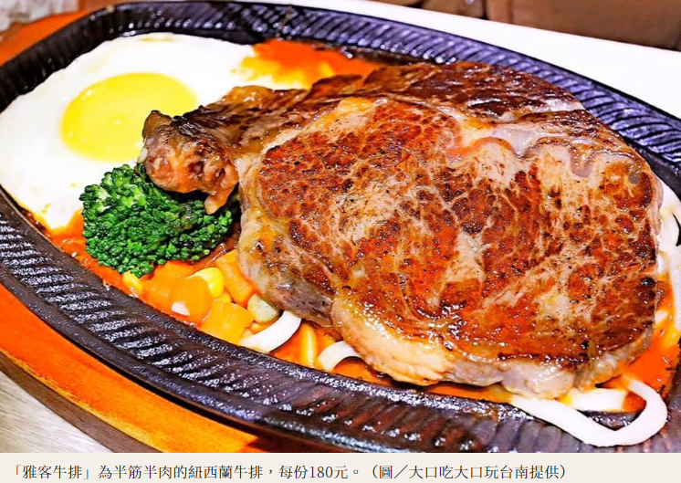 台南海安路上的「雅客牛排」是今年新開幕的平價牛排館,部落客大口吃大口玩台南就在臉書專頁上,曬出一整桌擺滿澎派Buffet菜色以及厚實的鐵板牛排照,發文推薦「排餐180元、自助吧無限供應,有100分鐘的吃飯限制時間」,誘人的肉排大餐吸引近2000人按讚,大口強調雖然價格便宜,但店家是採用100%原塊肉,她建議初次來店可以點用重達200克的紐西蘭牛排,半筋半肉超級大面,只要花180元就可以吃的非常飽足,另外雞腿排也是同樣價位,足足有八兩重,肉夠厚鮮嫩豐汁。