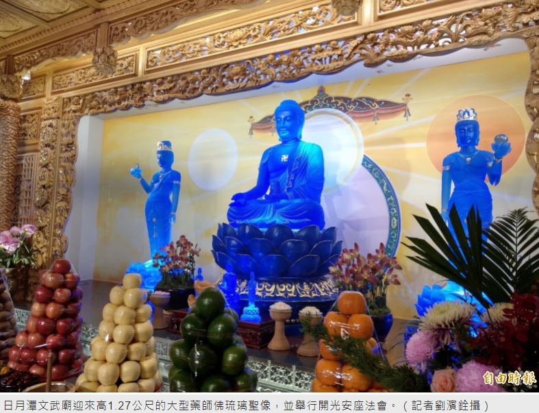 日月潭文武廟,是國內外遊客到潭區都會朝聖的景點,今廟方為近期迎來的藥師佛琉璃像,進行開光法會,佛像高1.27公尺,由寶藍色琉璃打造,展現莊嚴聖像,該廟原本主祀孔子、關公、岳飛,2年前從杭州西湖迎來月下老人,如今又有藥師佛坐鎮,成為儒釋道一體的廟宇,廟方盼掌管健康延壽的藥師佛,能增加日月潭的宗教多元性,讓信眾祈求身體健康、富貴平安,並成為潭區宗教文化亮點。 廟方今為藥師佛琉璃聖像,以及左右護持日光菩薩、月光菩薩等「東方三聖」,舉行開光安座儀式,場面莊嚴隆重,尤其高大的寶藍色藥師琉璃佛一亮相,更是吸引在場所有人的目光。 廟方表示,近年少子化嚴重,才會在2年前迎來月老,讓未婚男女可以求姻緣,而月老香火鼎盛,也讓許多佳偶都會回贈喜餅,為了讓其他信眾也能祈求健康長壽,此次才會迎回藥師佛,尤其高達1.27公尺的佛像,還是以琉璃打造,鑄造不易更顯難能可貴,希望藥師佛能庇佑信眾身體健康,延年長壽。