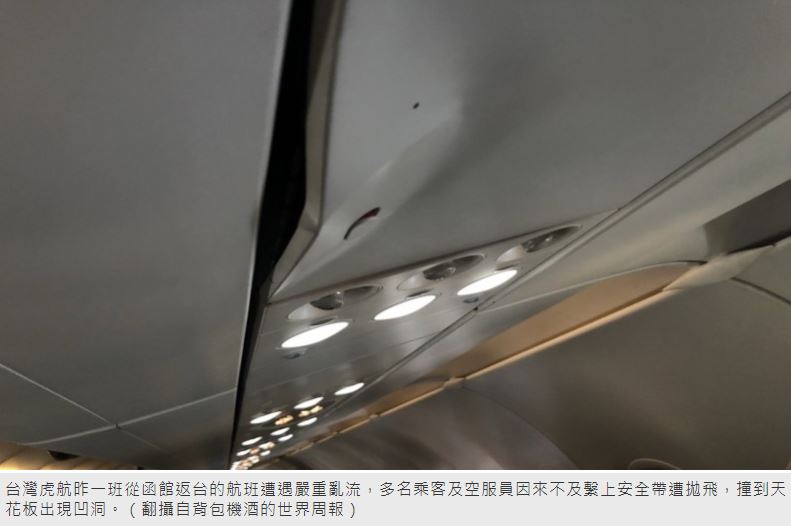 臉書粉絲專頁「背包機酒的世界周報」指出,昨耶誕節搭乘台灣虎航IT-237航班時遇到嚴重大亂流,持續大約6到7分鐘,所幸旅客們並沒受傷,但飽受驚嚇,而站立工作的空服組員則是飛到天花板後下摔。