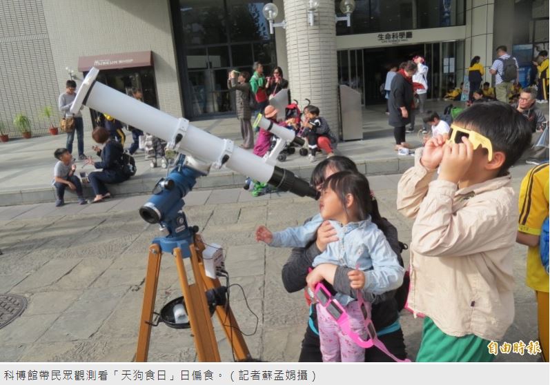 天狗來食日了!科博館今日下午辦觀測活動,帶民眾製作日食眼鏡或透過太陽望遠鏡,觀測今年最後一個特殊天文事件「日偏食」,不少民眾體驗後直呼看到「太陽被咬一口」。